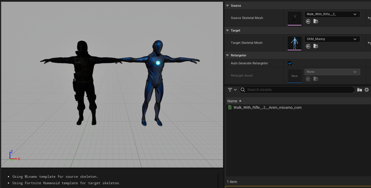 원래는 T pose 였던 Mixamo 타겟이 현재는 자동으로 포즈가 잡혀있다. 이전 버전에서는 일일이 본의 위치를 잡아주느라 오래걸렸고, 잡아도 해당하는 본과 관절들이 빗나가면 뒤틀렸는데 그런게 훨씬 줄었다고 볼 수 있다. 진짜 어마어마한 기능이다. 엄청난 시간 단축이 되는 워크플로우다. 리타겟 에셋을 뽑고, 이후에는