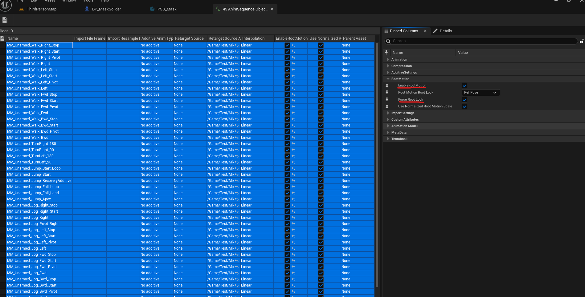 이렇게 설정해주고, 한가지 미리 해야하는게 있는데, 애니메이션 시퀀스들이 전부 Root Motion인 상태이어야 한다.
